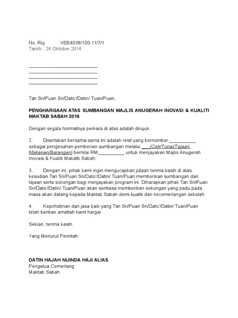 No 66 & 66a jalan sri bahari 10050 pulau pinang tuan/puan, penghargaan atas sumbangan . Tq customers saham akhirat sudah menanti. Sumbangan telah kami terima sebesar rp. Adalah saya dengan hormatnya merujuk . Contoh surat ucapan terima kasih atas sumbangan kewangan bagikan contoh. 4 oktober 2014 kepada : 4 oktober 2014 kepada : Pihak yang dimaksud dan alamat lengkapnya; Pembuka surat (umumnya berisi pembukaan dan penghargaan); Adalah saya dengan hormatnya merujuk. Surat penghargaan dan ucapan terima kasih daripada biro pengaduan awam putrajaya.